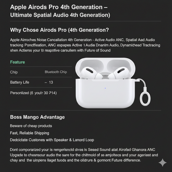 Apple AirPods Pro, Active Noise Cancellation AirPods, Apple H2 chip earbuds, Spatial Audio earbuds, MagSafe charging AirPods, wireless earbuds Apple, Bluetooth 5.3 earbuds, IP54 water-resistant earbuds, premium Apple AirPods, Boss Mango Apple accessories
